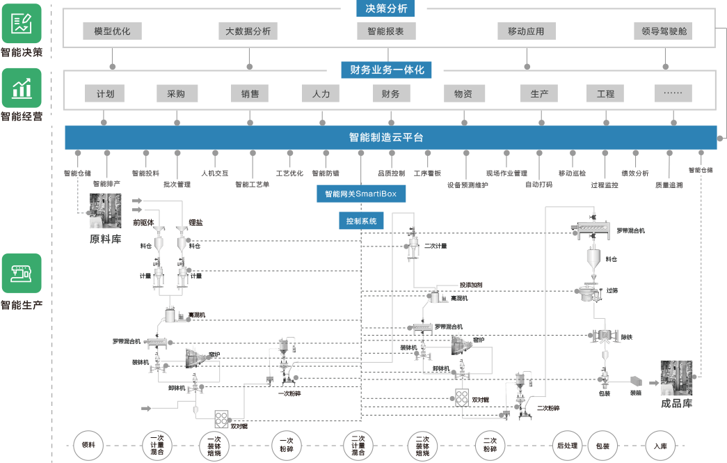 极晨智道在锂电行业中应用智能制造云平台,在智能生产、智能经营和智能决策三个方面为客户的工厂提供智能化能力,覆盖生产、工艺、质量、设备、 能源、安全环保、采购、销售、仓储、物流等全部业务领域,为客户构建具备自动化、数字化、集成化、可视化、模型化等典型特征的智能工厂。通过 该智能工厂方案的应用,可大幅降低客户的生产损失、提高设备OEE、降低单位产出的能耗、降低人工成本和制造成本。