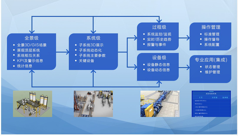 采用实时数据采集与三维模拟场景交互,实现各种工艺过程控制。可对生产车间进行4个层级的数据展示与分析,包括全景级、系统级、过程设备级、 操作管理与应用级别,如下图所示: